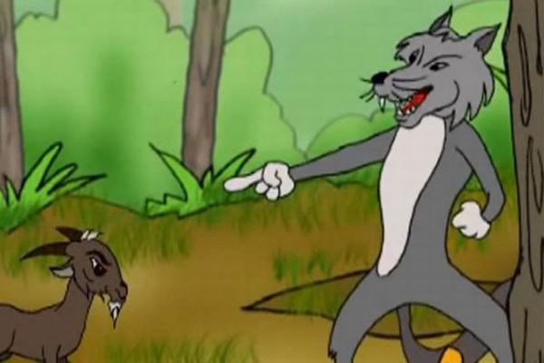 Dê đen cũng đi tới khu rừng để ăn cỏ non và uống nước suối. Đang tha thẩn ngặm cỏ, chợt Sói xuất hiện, nó quát hỏi: