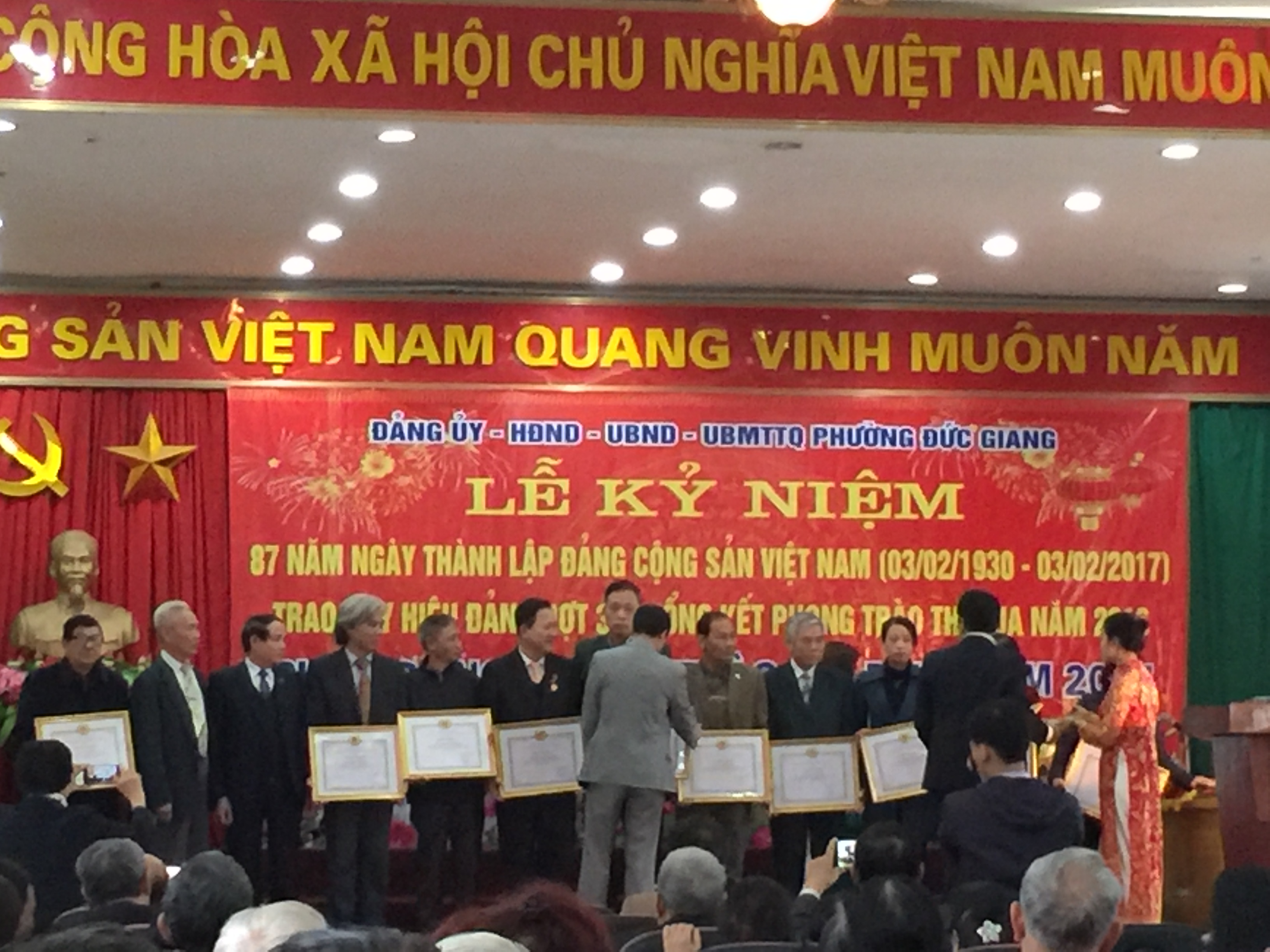 Ngày 21 tháng 01 năm 2017 tại Nhà văn hóa Phường Đức Giang, Đảng ủy – HĐND – UBND – UBMTTQ phường Đức Giang đã long trọng tổ chức Lễ kỷ niệm 87 năm ngày thành lập Đảng cộng sản Việt Nam (03/02/1930 – 03/02/2017) Trao huy hiệu Đảng và Tổng kết phong trào thi đua năm 2016.