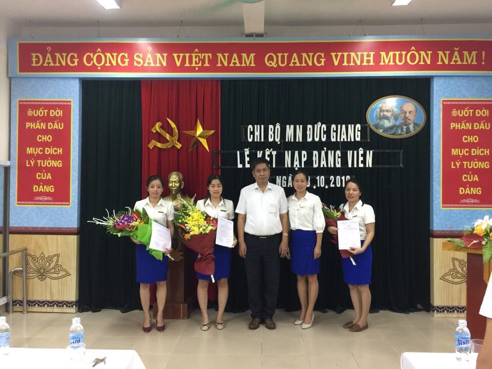 Đồng chí Đào Thị Hương, đồng chí Nguyễn Thị Ánh Hồng và đồng chí Vũ Thị Thủy đều là những giáo viên, nhân viên trẻ, có lập trường tư tưởng, chính trị vững vàng; chấp hành tốt mọi chủ trương, đường lối của Đảng, chính sách pháp luật của Nhà nước; thực hiện tốt các nội quy, quy chế của Nhà trường; tích cực tham gia các hoạt động phong trào, nhất là các hoạt động của Đoàn Thanh niên. Ghi nhận những cố gắng trong suốt thời gian qua của các đồng chí, được sự giới thiệu và quan tâm giúp đỡ của các đồng chí đảng viên trong Chi Bộ trường mầm non Đức Giang, cùng sự nhất trí của BCH Chi bộ Nhà trường. Chi bộ trường Mầm non Đức Giang tổ chức Lễ kết nạp đảng viên mới cho ba đồng chí.