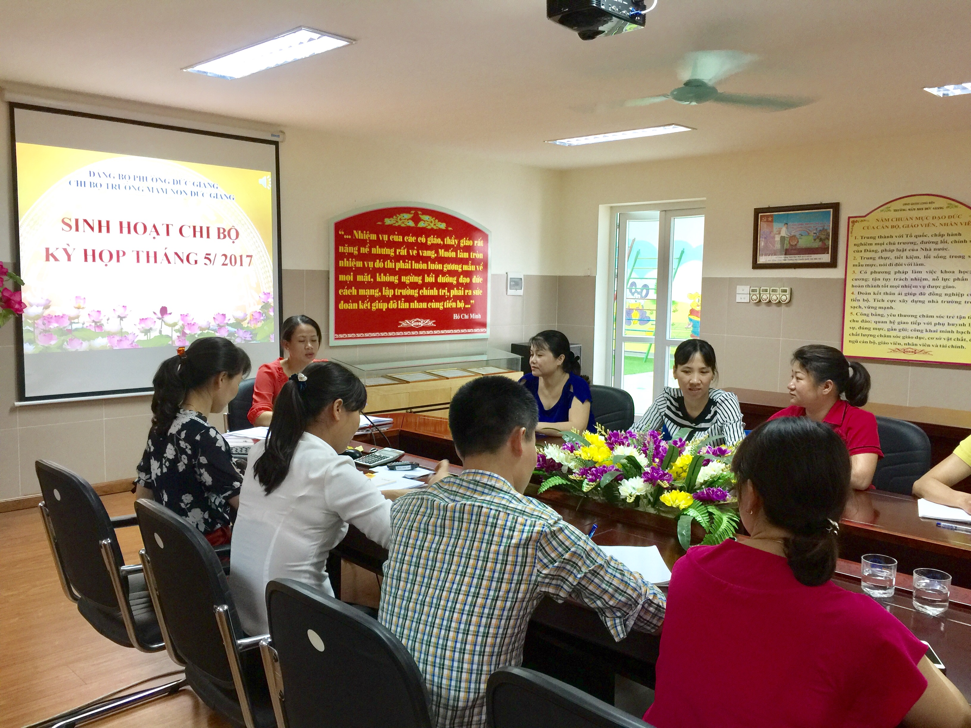 Ngày 5 tháng 5 năm 2017 tại phòng Hội đồng cơ sở 2, Chi bộ trường mầm non Đức Giang đã tổ chức phiên họp thường kỳ. Về dự họp có đầy đủ 19 đ/c đảng viên trong chi bộ. Đồng chí Nguyễn Thị Lan Anh, Bí thư chi bộ chủ trì cuộc họp.
