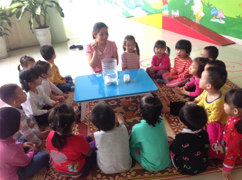 Hoạt động đầu tiên các bé được làm thí nghiệm về “vật chìm, vật nổi”qua đó trẻ biết được trong cuộc sống xung quanh trẻ những vật nào sẽ nổi những vật nào sẽ chìm.