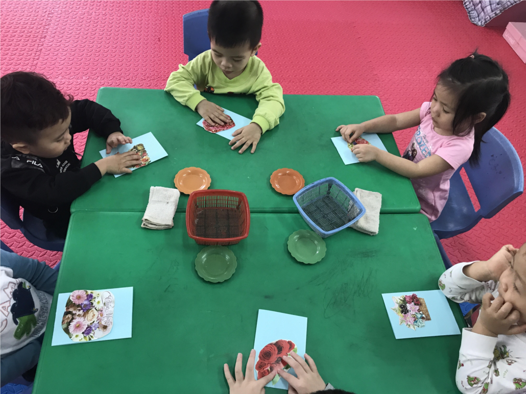 Các bạn lớp Mẫu giáo bé C3 tham gia vào hoạt động dán và trang trí bưu thiếp tặng bà, tặng mẹ như một lời cảm ơn và cũng là tình cảm của trẻ dành cho bà và mẹ.