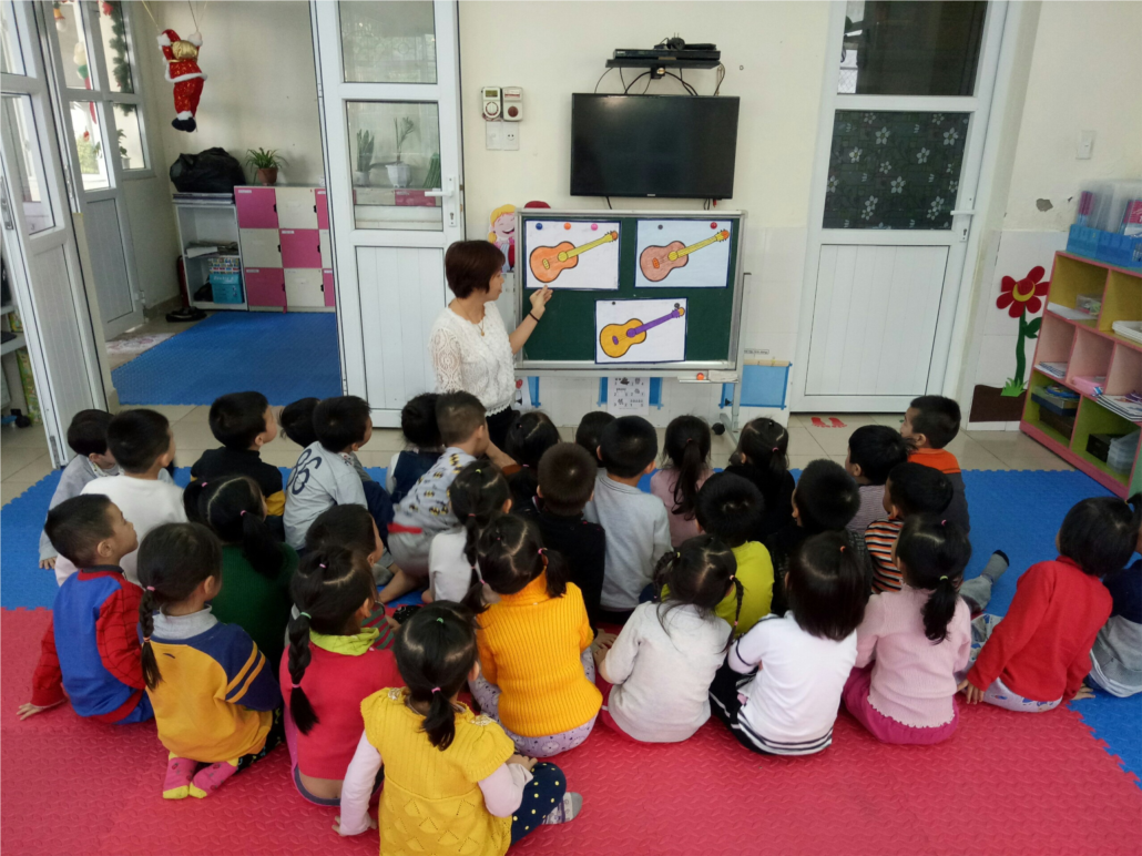 Cô giáo Nguyễn Thị Thủy hướng dẫn trẻ quan sát, ngắm nhìn, nhận xét những bức mẫu vẽ đàn ghi-ta bằng những sáng tạo và cảm thụ màu sắc theo cách riêng của trẻ, khuyến khích trẻ hứng thú vẽ tranh… Bằng sự hào hứng trẻ ghi lại những ấn tượng đó qua các nét vẽ ngây thơ, trong sáng của mình.