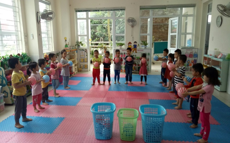 Trẻ biết cách chuyền bóng cho bạn, bạn phía sau biết cách đỡ lấy bóng từ trên.