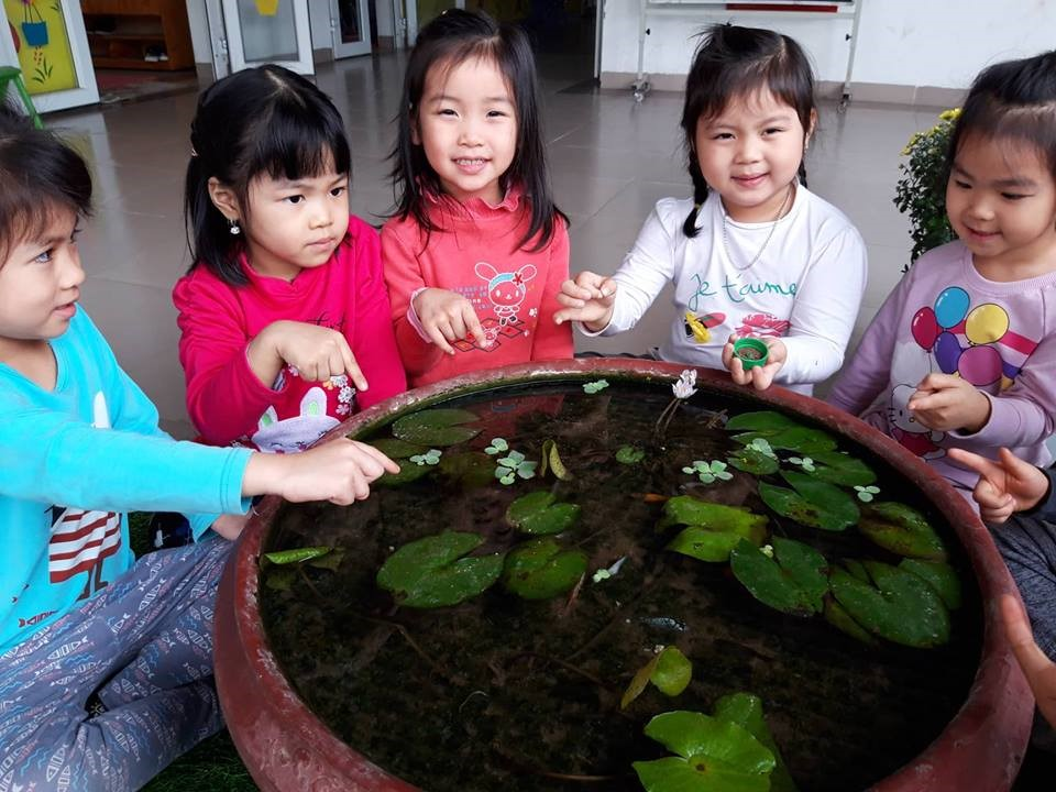 Hôm nay, cô giáo đã dẫn các bạn nhỏ đi quan sát bể cá. Các bạn nhỏ lớp B3 rất hào hứng, phấn khởi, bạn nào cũng chăm chú quan sát đàn cá vàng đang bơi lượn.