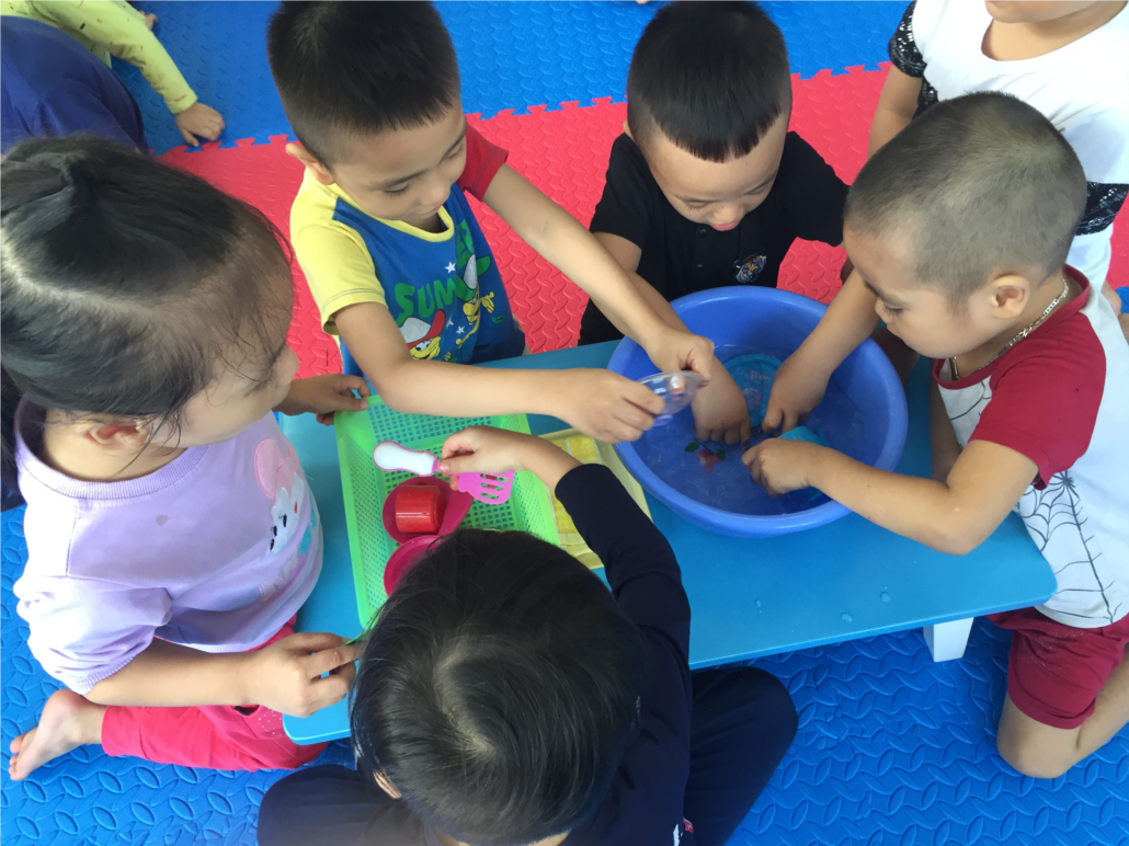 Các bé lớp B3 trải nghiệm để biết lợi ích của nước