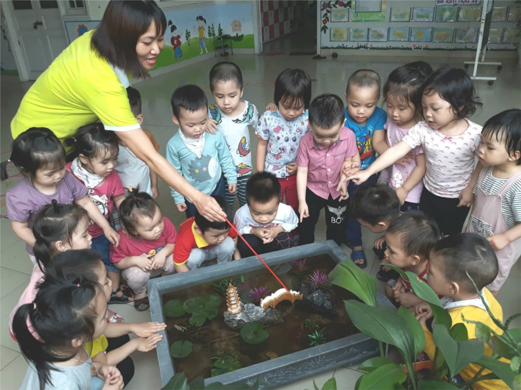 Cô và các bé đang quan sát, trò chuyện về con cá vàng