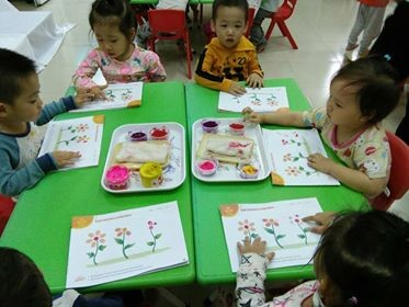 Sau đây là một số hình ảnh các bạn nhỏ lớp D1 tham gia tiết học tạo hình: “ In ngón tay tạo thành cánh hoa”