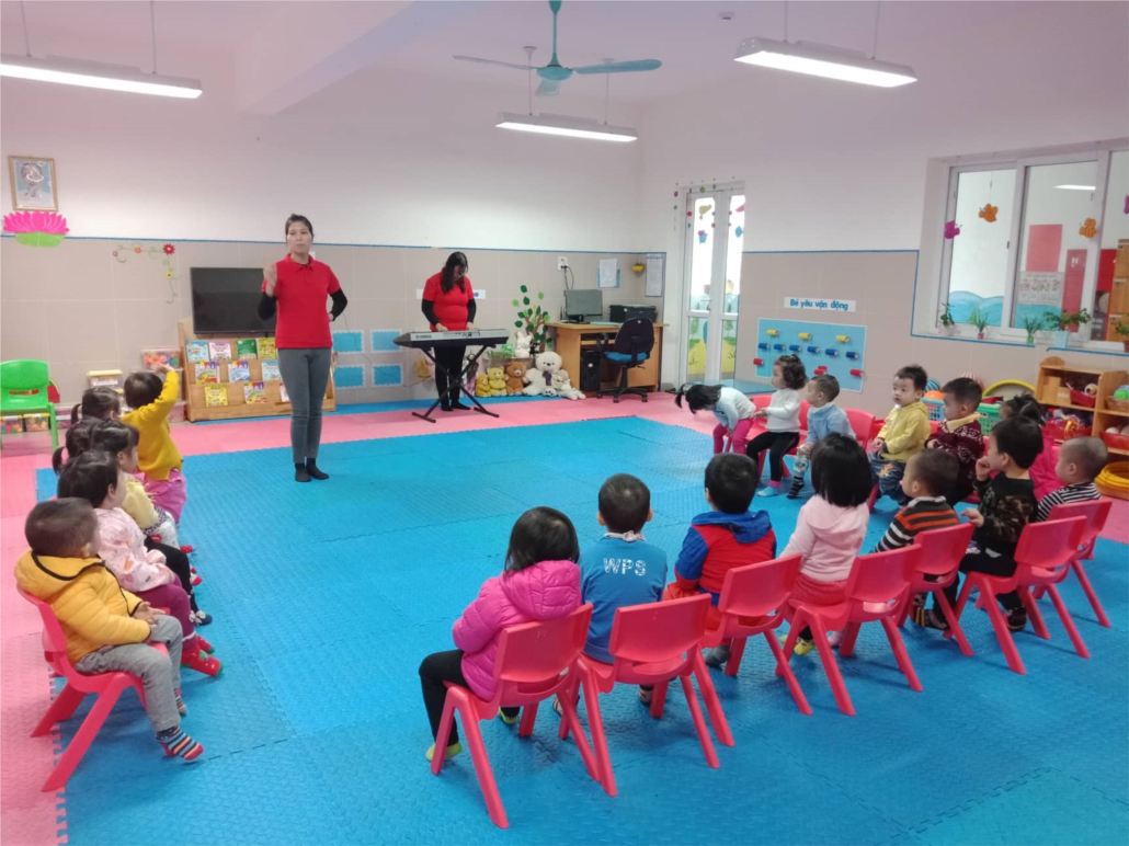 Khi tập hát, điều mà trẻ tiếp thu được không chỉ có giai điệu, tiết tấu, mà những lời ca giản dị, dễ hiểu còn giúp trẻ trang bị thêm vốn từ, cách diễn đạt. Mặt khác, âm nhạc cũng đóng góp tích cực cho việc phát triển thể chất của trẻ. Biết được ý nghĩa quan trọng của âm nhạc đối với trẻ mầm non, cô và trẻ lớp nhà trẻ D3 rất vui vẻ và hào hứng khi tới giờ âm nhạc.