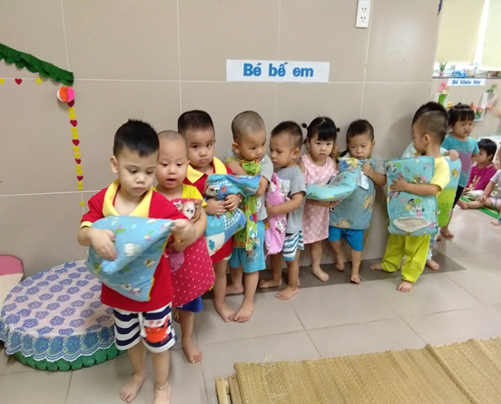 Trẻ lần lượt xếp hàng vào lấy gối và lên giường nằm theo đúng thứ tự