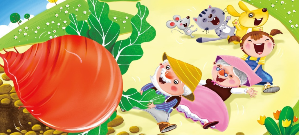 “Chít, chít, chít! Tới đây, tới đây.” Chuột nhắt bèn chạy ra kéo Mèo con, Mèo con kéo Chó con, Chó con kéo cô cháu gái, cô cháu gái ôm lấy bà lão, bà lão ôm lấy ông lão, ông lão ôm lấy lá củ cải, mọi người cùng nhổ. “Dô ta nào! Dô ta nào! Nhổ cải lên, nhổ cải lên! Ái chà chà, ái chà chà lên được rồi!” Cuối cùng thì cây cải cũng được kéo lên khỏi mặt đất. Mọi người cùng hò reo vì sung sướng rồi vác củ cải khổng lồ đem về nhà.