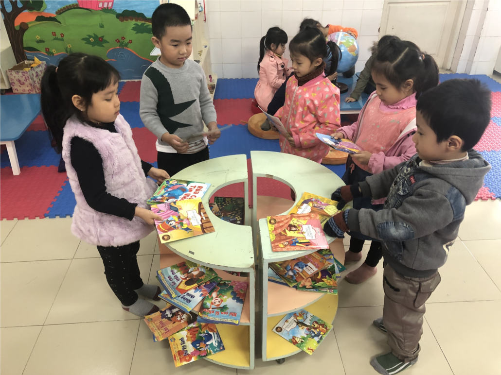 Tại các lớp học trong nhà trường, các góc thư viện, sách truyện được đội ngũ giáo viên của từng lớp quan tâm xây dựng. Hệ thống giá, kệ được sắp đặt tạo ra một không gian riêng cho trẻ hoạt động. Các sách, truyện tranh, thơ ca, câu đố… phù hợp với trẻ được sắp xếp và thay đổi linh hoạt tạo hứng thú cho trẻ. Tại góc thư viện, cô và trẻ cùng chia sẻ đọc sách trong hoạt động phát triển ngôn ngữ: đọc thơ, truyện kể, câu đố …; tổ chức cho trẻ kể chuyện, tham gia các trò chơi đóng vai theo tác phẩm văn học…Trong hoạt động chơi ở các góc, trẻ được tự do làm quen với sách, chia sẻ việc đọc sách với các bạn trong nhóm nhỏ hoặc đọc sách độc lập.