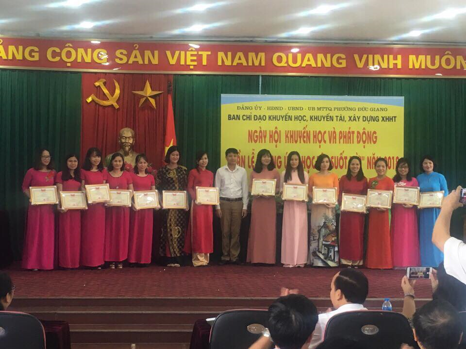 Thực hiện Kế hoạch số 352/KH-UBND ngày 12/9/2014 của UBND Quận Long Biên về tổ chức "Tuần lễ hưởng ứng học tập suốt đời và Ngày Hội Khuyến học trên địa bàn quận Long Biên", ngày 30/9/2018 tại UBND phường Đức Giang, chào mừng ngày Khuyến học Việt Nam 2/10, Đảng ủy- HĐND- UBND- MTTQ phường Đức Giang tổ chức Ngày Hội khuyến học và phát động Tuần lễ hưởng ứng học tập suốt đời năm 2018.
