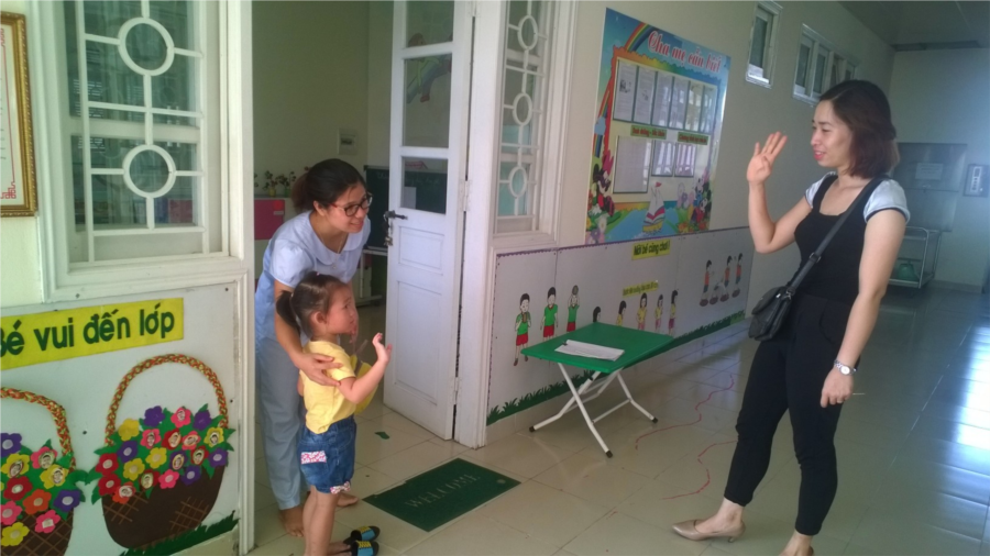 Các bé đến lớp còn khóc không muốn vào lớp cô giáo và bậc phụ huynh tham gia, như một sự động viên khích lệ cho con khi bước vào môi trường mới.